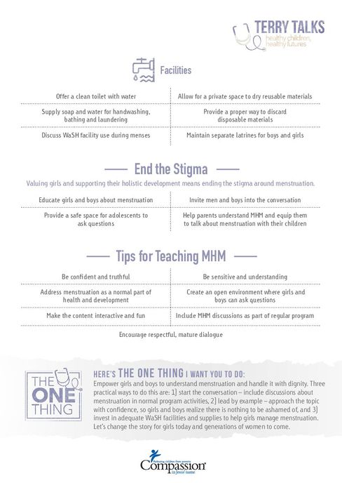 "Menstrual Hygiene Management" is the eleventh edition of Terry Talks, a curriculum of ongoing video presentations and supporting materials led by Terry Laura (Health Technical Advisor at Compassion International). The resources are aimed at equipping and encouraging health and child advocates to learn, build on and put into practice their expertise in health, especially as it relates to children in poverty.