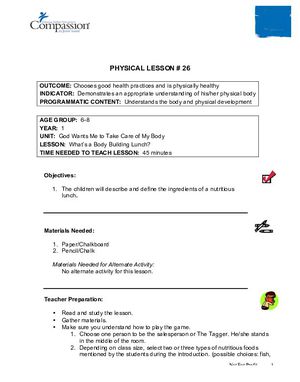 The lesson “What’s A Body Building Lunch?” is part 26 of a 42 part series on human development, the human body, health, and safety. This lesson teaches aboutnutrition and has the children play games that emphasize good nutrition. This resourceincludes a lesson plan for the teacher on how to prepare beforehand, class-time contentto facilitate learning, hands-on activities facilitating further learning, and a teacherassessment at the end. This lesson is designed for a group of young children between the ages of 6 and 8, and is the twenty-sixth physical development lesson in the CoreCurriculum, 6-8 years, Year One