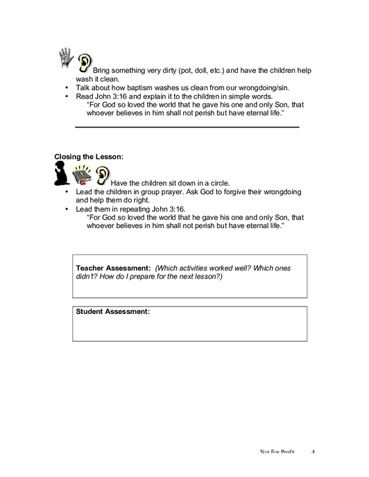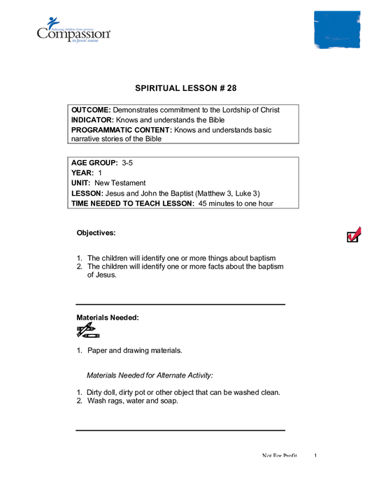 The lesson “Jesus and John the Baptist” teaches children about John the Baptist in the Bible and what it means to be baptized. The children will identify one or more facts about the baptism of Jesus. The lesson includes guided instructions for the teacher, including preparation, a script, and suggested activities to facilitate further learning in a fun and interactive manner. This lesson is designed for children between 3-5 years, and is the 28th lesson in the 1st Year Core Curriculum Set and part of the “New Testament” unit.