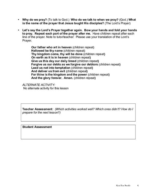The lesson “Sermon on the Mountain: The Lord’s Prayer” teaches children about talking to God, praying, and developing a personal relationship with Him. The children will identify the prayer Jesus taught His followers as The Lord’s Prayer and through a rhyming activity, they will memorize the first line of the Lord’s Prayer. Each child will identify something for which he or she can pray. The lesson includes guided instructions for the teacher, including preparation, a script, and suggested activities to facilitate further learning in a fun and interactive manner. This lesson is designed for children between 3-5 years, and is the 29th lesson in the 2nd Year Core Curriculum Set and part of the “New Testament” unit.