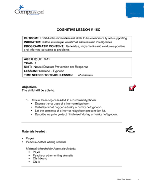 The lesson “Hurricane - Typhoon” teaches children the different causes of hurricanes and typhoons, as well as what happens during the natural disaster. The children will learn to list the contents of a hurricane or typhoon preparation kit and explain how to remain safe and protect themselves if the situation were to occur. The lesson includes guided instructions for the teacher, including preparation, a script, and suggested activities to facilitate further learning in a fun and interactive manner. This lesson is designed for children between 9-11 years, and is the 16th lesson (Part C) in the 1st Year “Natural Disaster Prevention and Response” unit.