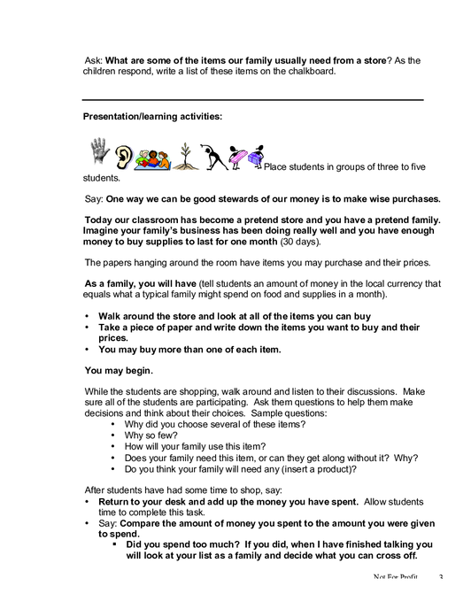 The lesson “Shopping Wisely” helps to develop motivation and knowledge in children to enable them to be economically self-supporting in the future. The children will learn and define at least two principles of how to shop wisely and manage a budget. Each child will have the opportunity to apply these principles through shopping in an imaginary store. The lesson includes guided instructions for the teacher, including preparation, a script, and suggested activities to facilitate further learning in a fun and interactive manner. This lesson is designed for children between 6-8 years, and is the 34th lesson in the 1st Year “Real-Life Problem Solving Skills” unit.