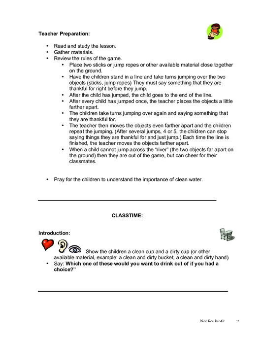 The lesson “Clean Water to Drink, Clean Water to Cook” is part 35 of a 42 part series on human development, the human body, family, health, and safety. This lesson teaches the importance of using clean or purified water to consume. This resource includes a lesson plan for the teacher on how to prepare beforehand, class- time content to facilitate learning, hands-on activities facilitating further learning, and a teacher assessment at the end. This lesson is designed for a group of young children between the ages of 6 and 8, and is the thirty-fifth physical development lesson in theCore Curriculum, 6-8 years, Year One.