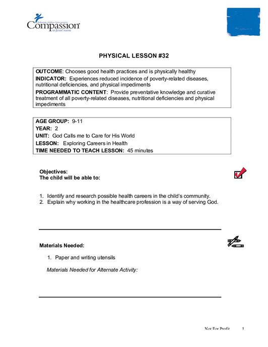 The lesson “Exploring Careers In Health” is part 32 of a 35 part series on human development, the human body, health, and safety. This lesson invites the children to ask questions to a healthcare professional who is a guest speaker. This resource includes a lesson plan for the teacher on how to prepare beforehand, class-time content to facilitate learning, hands-on activities facilitating further learning, and a teacher assessment at the end. This lesson is designed for a group of children between the ages of 9 and 11, and is the thirty-second physical development lesson in the Core Curriculum, 9-11 years, Year Two.