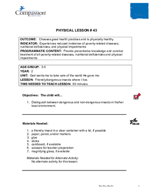 The lesson “Friendly/Dangerous Insects Where I Live” is part 43 of a 44 part series on human development, family, health, and safety. This lesson teaches how to identify harmful and friendly insects. This lesson will require customization by the teacher to the local area. This resource includes a lesson plan for the teacher on how to prepare beforehand, class-time content to facilitate learning, hands-on activities facilitating further learning, and a teacher assessment at the end. This lesson is designedfor a group of young children between the ages of 3 and 5, and is the forty-third physical development lesson in the Core Curriculum, 3-5 years, Year Two.