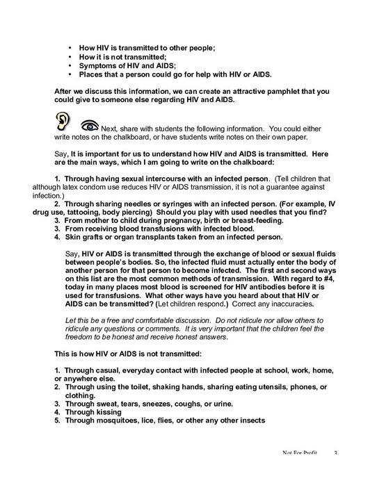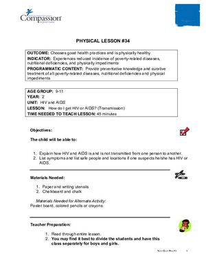 The lesson “How Do I Get HIV/AIDS?” is part 34 of a 35 part series on human development, the human body, health, and safety. This lesson teaches basic facts about the HIV/AIDS virus and the methods of passing the virus to others. This resource includes a lesson plan for the teacher on how to prepare beforehand, class-time content to facilitate learning, hands-on activities facilitating further learning, and a teacher assessment at the end. This lesson is designed for a group of children between the ages of 9 and 11, and is the thirty-fourth physical development lesson in the Core Curriculum, 9-11 years, Year Two.