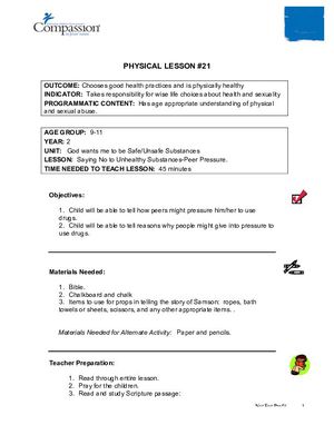 The lesson “Saying No to Unhealthy Substances: Peer Pressure is part 21 of a 35 part series on human development, the human body, health, and safety. This lesson teaches children to reject drugs, alcohol, or cigarettes. This resource includes a lesson plan for the teacher on how to prepare beforehand, class-time content to facilitate learning, hands-on activities facilitating further learning, and a teacher assessment at the end. There is an alternate activity suggested. This lesson is designed for a group of children between the ages of 9 and 11, and is the twenty-first physical development lesson in the Core Curriculum, 9-11 years, Year Two.