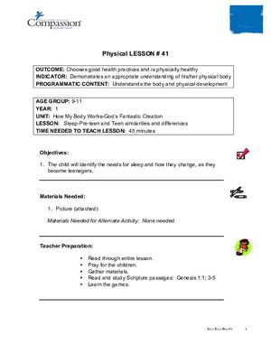 The lesson “Sleep: Pre-teen and Teen Similarities and Differences” is part 41 of a 46 part series on human development, the human body, health, and safety. This lesson teaches about the importance of appropriate sleep in good health. This resource includes a lesson plan for the teacher on how to prepare beforehand, class-time content to facilitate learning, hands-on activities facilitating further learning, and a teacher assessment at the end. This lesson is designed for a group of young children between the ages of 9 and 11, and is the forty-first physical development lesson in the Core Curriculum, 9-11 years, Year One.