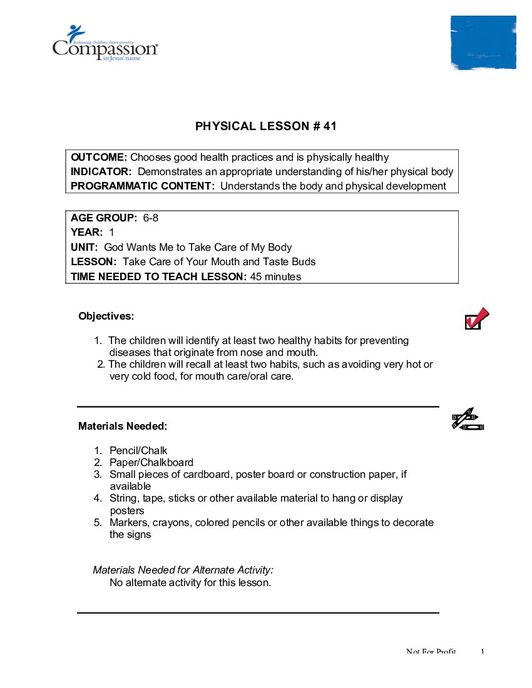 The lesson “Take Care of Your Mouth and Taste Buds” is part 41 of a 44 part series on human development, the human body, health, and safety. This lesson teaches about the sense of taste and keeping the tongue healthy. This resource includes a lesson plan for the teacher on how to prepare beforehand, class-time content to facilitate learning, hands-on activities facilitating further learning, and a teacher assessment at the end. This lesson is designed for a group of young children between the ages of 6 and 8, and is the forty-first physical development lesson in the CoreCurriculum, 6-8 years, Year One.