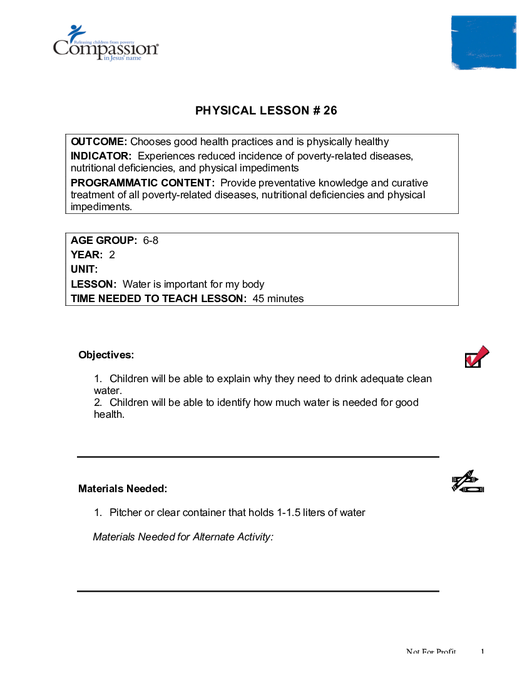 The lesson “Water Is Important for My Body” is part 26 of a 46 part series on human development, the human body, health, and safety. This lesson teacheschildren to drink appropriate amounts of clean water to help the body to function well. This resource includes a lesson plan for the teacher on how to prepare beforehand,class-time content to facilitate learning, hands-on activities facilitating further learning, and a teacher assessment at the end. This lesson is designed for a group of young children between the ages of 6 and 8, and is the twenty-sixth physical development lesson in the Core Curriculum, 6-8 years, Year Two.