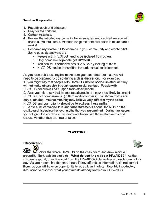 The lesson “What Is HIV/AIDS (Myths & Facts)” is part nine of a 46 part series on human development, the human body, health, and safety. This lesson teaches about basic facts about the HIV/AIDS infection. This resource includes a lesson plan for the teacher on how to prepare beforehand, class-time content to facilitate learning, hands-on activities facilitating further learning, and a teacher assessment at the end. This lesson is designed for a group of young children between the ages of 9 and 11, and is the ninth physical development lesson in the Core Curriculum, 9-11 years, Year One.