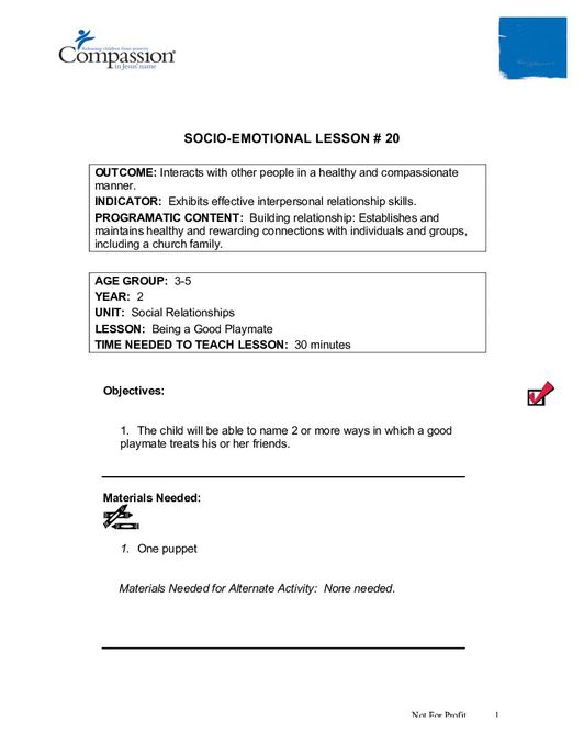 The lesson “Being a Good Playmate” teaches children more about building relationships and the importance of interacting with others in a kind and compassionate manner, and what that looks like when interacting with friends. Children will name at least two ways a good playmate treats friends and will practice those behaviors with classmates. The lesson includes guided instructions for the teacher, including preparation, a script, and suggested activities to facilitate further learning in a fun and interactive manner. This lesson is designed for children between 3-5 years, and is the 20th lesson in the 2nd Year Core Curriculum Set and part of the “Social Relationships” unit.