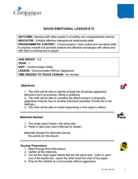 The lesson “Communicates without Aggression” teaches children about the importance of effective communication and positive exchanges based on developing Godly character. Children are taught to identify the difference between aggressive and unkind physical behavior and kind and appropriate ways to respond. They will come to understand the outcome of physically aggressive behavior, such as hitting, and will model kind ways to respond and interact with others as an alternative. The lesson includes guided instructions for the teacher, including preparation, a script, and suggested activities to facilitate further learning in a fun and interactive manner. This lesson is designed for children between 3-5 years, and is the 31st lesson in the 1st Year Core Curriculum Set and part of the “Communications Skills” unit.