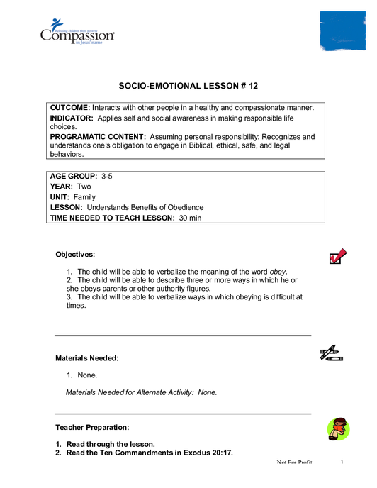 The lesson “Understands Benefits of Obedience” teaches children about social and self-awareness, as well as personal responsibility and obedience. Children understand that through obeying the rules of parents and authority, they are developing Godly character. The children will also verbalize how it may be difficult to obey at times, but understand that God made rules for many reasons, including safety, protection, and care. The lesson includes guided instructions for the teacher, including preparation, a script, and suggested activities to facilitate further learning in a fun and interactive manner. This lesson is designed for children between 3-5 years, and is the twelfth lesson in the 2nd ear Core Curriculum Set and part of the “Family” unit.